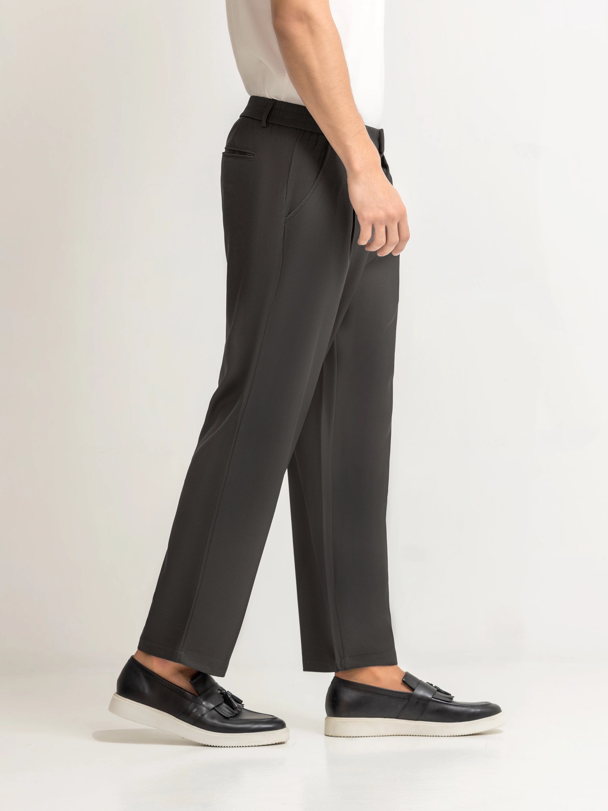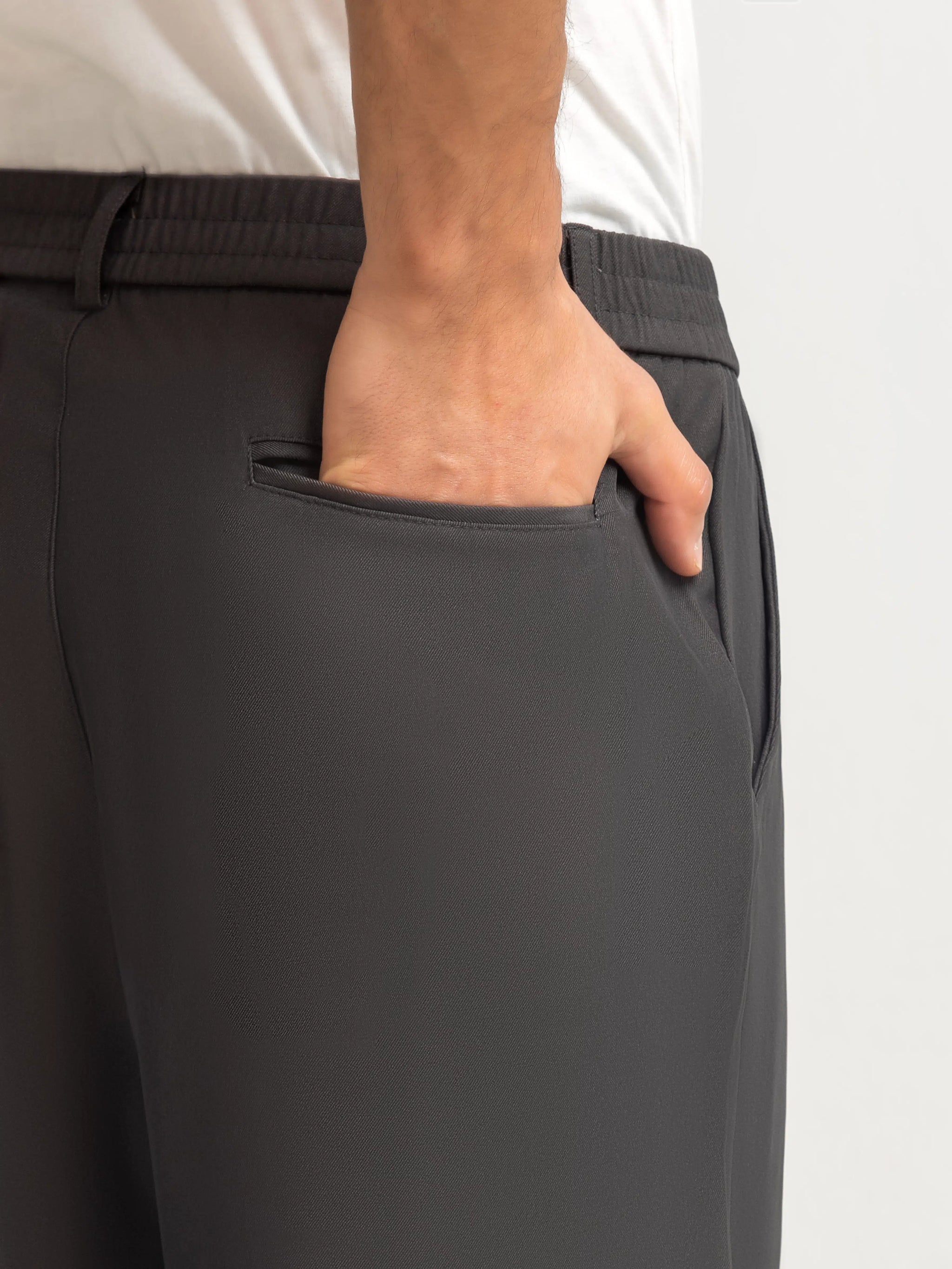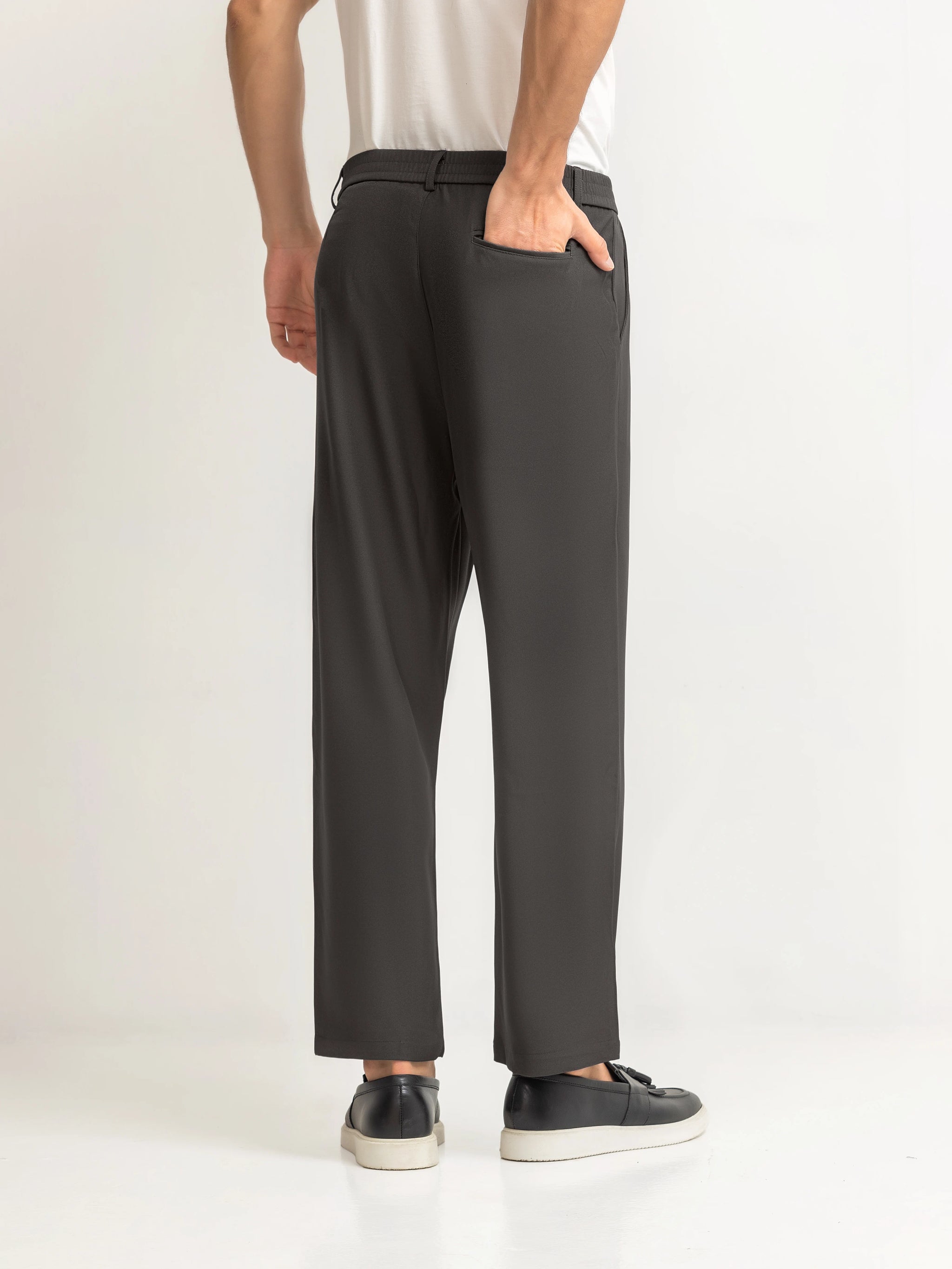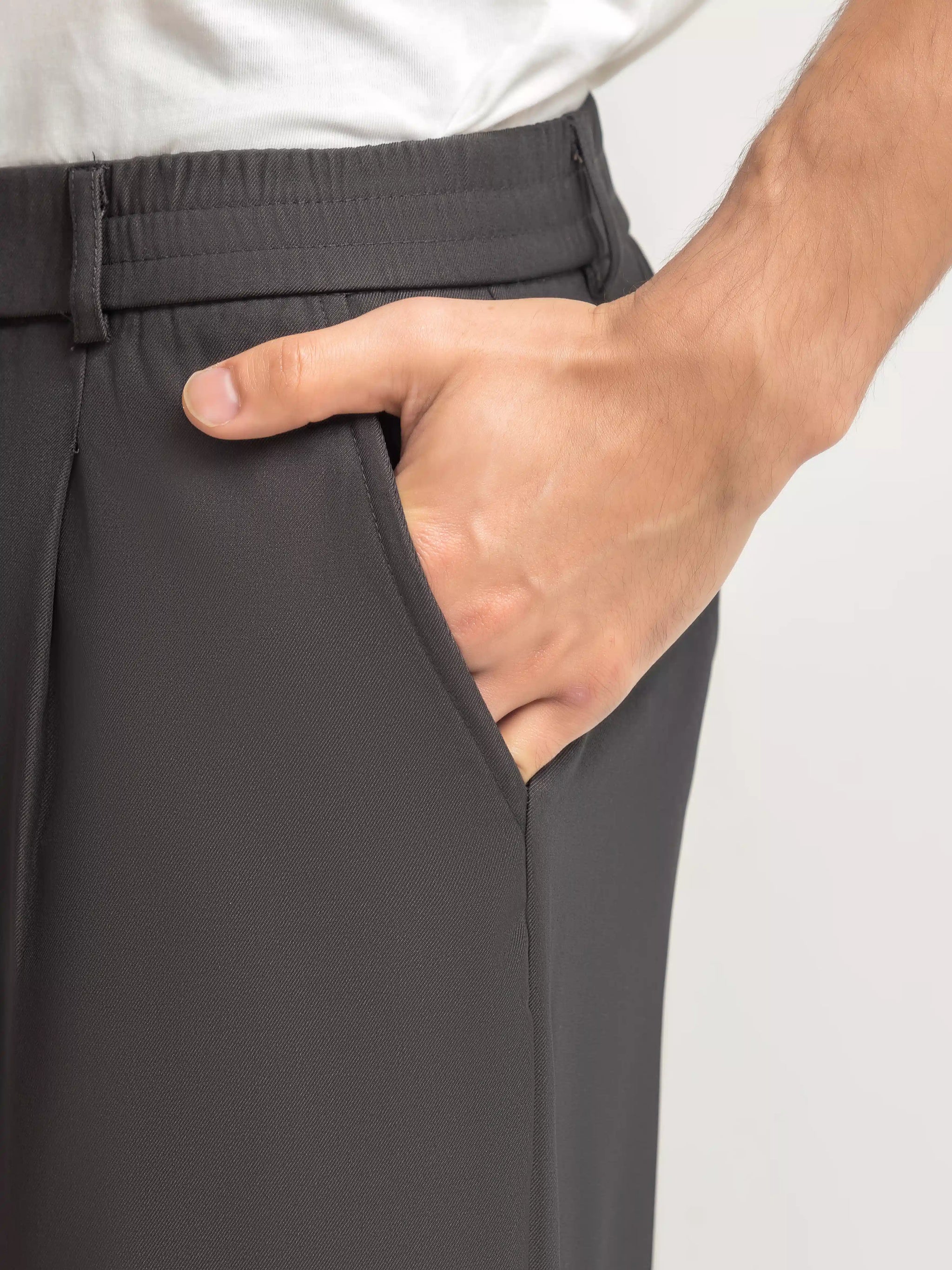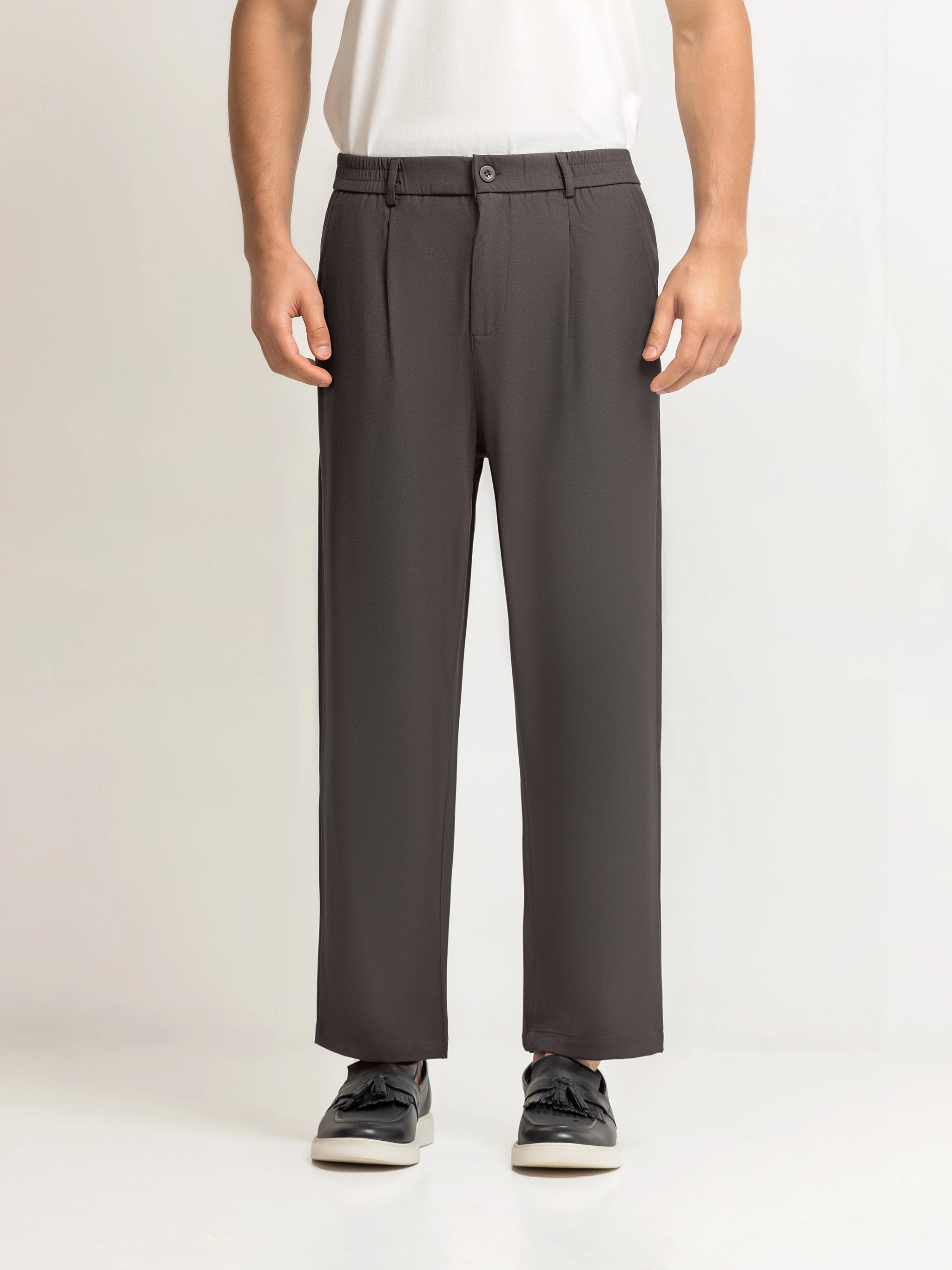Straight-Leg Relaxed Fit Trousers in Blended Stretch Fabric, Combining Classic Pleats with Everyday Comfort. Finished with DTM Buttons for a Refined Look. Perfect for Office Wear, Daily Styling, and Elevated Smart-Casual Outfits.