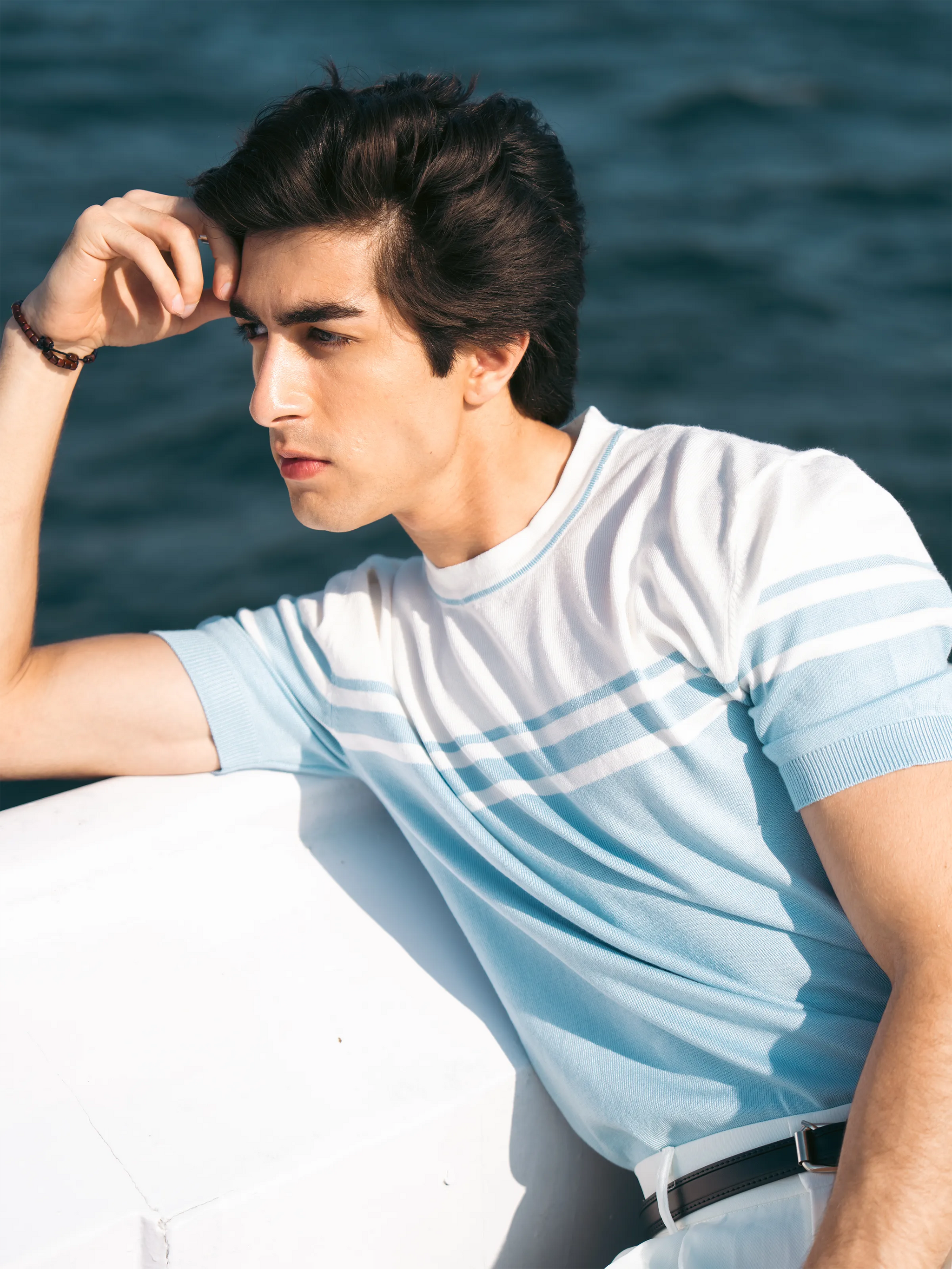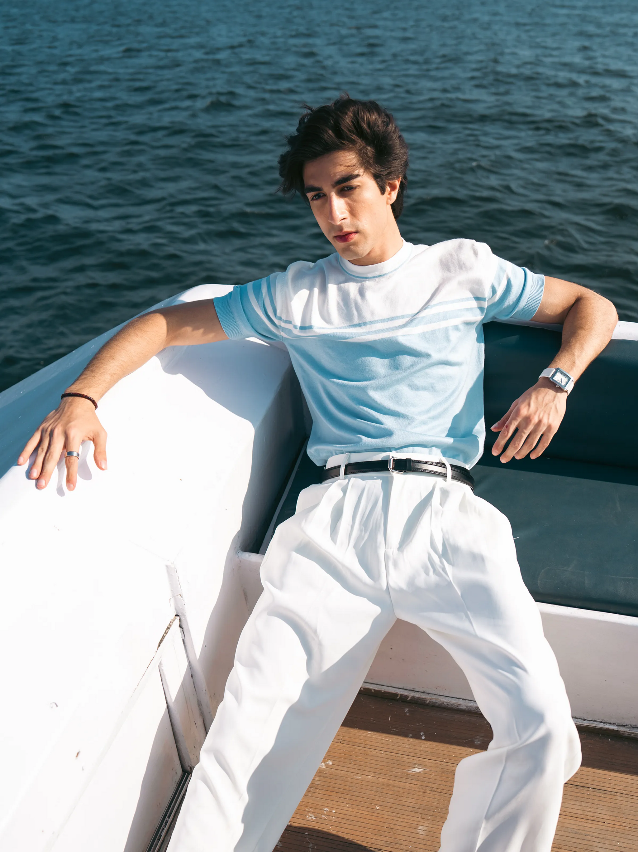 Design: This T-shirt Features a Bicolor Design, with a White Upper Section & a Sky Blue Lower Section, Separated by White & Blue Horizontal Stripes.