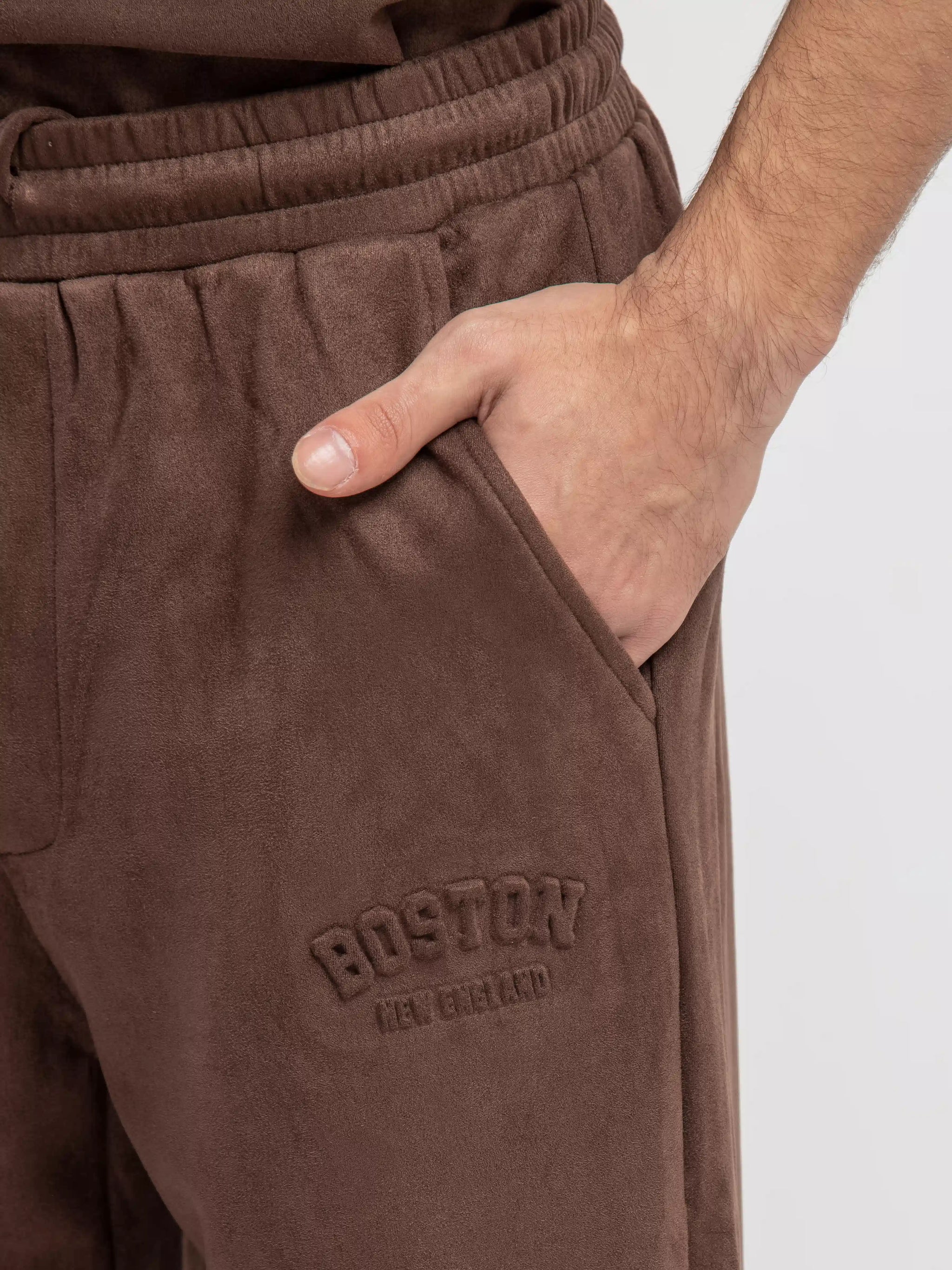 Relaxed Fit Trousers crafted from Soft Suede Fabric. Designed With a Breathable Feel For All-Day Comfort & Finished with Embossed Text at the Left. Features a tonal DTM Draw Cord for an Adjustable, Secure Fit. Designed to Pair Seamlessly with the Matching Top.